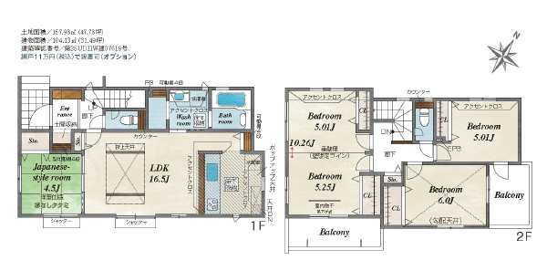 | 間取詳細 | (1F)LDK16.5帖、和4.5帖(2F)洋10.2帖、洋6帖、洋5帖 |