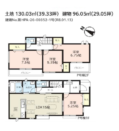 | 間取詳細 | (1F)LDK15帖、洋5.2帖(2F)洋7.5帖、洋6.7帖、洋5.2帖 |