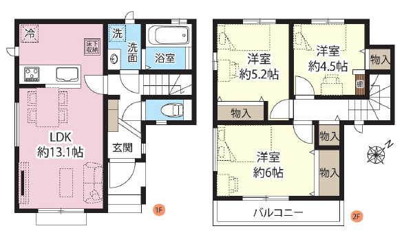 両方向道路で日当たり良好!蓮田市閏戸の4LDKの新築2階建です。リビングは16帖で家族ゆったりくつろげます。隣の和室5帖は客間やお昼寝スペースにいいですね。全室収納付きです。浴室乾燥機付きなので雨の日も安心です。インナーバルコニーはプライベートを守ってくれます。玄関灯や防犯カメラといった防犯対策もばっちりです。
