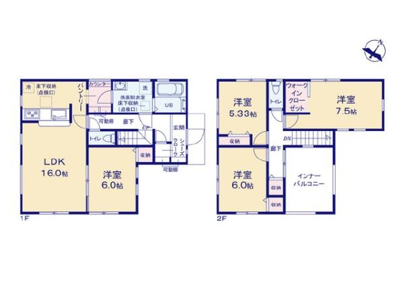 税制優遇の長期優良住宅!間取りは4LDK。リビングは広々16帖で家族団らんの場に。対面キッチンなのでご家族の様子が見られて安心です。隣の洋室5.2帖は客間やお昼寝スペースにいいですね。2階にウォークインクローゼットが2箇所あり、たっぷり収納できます。カースペースは並列2台分です。