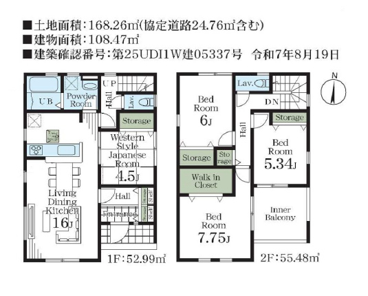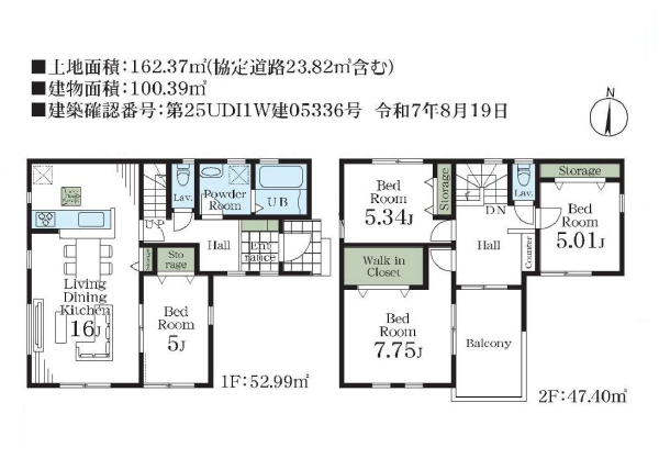 税制優遇の長期優良住宅!間取りは4LDK。リビングは広々16帖で家族団らんの場に。対面キッチンなのでご家族の様子が見られて安心です。隣の洋室5.2帖は客間やお昼寝スペースにいいですね。2階にウォークインクローゼットが2箇所あり、たっぷり収納できます。カースペースは並列2台分です。
