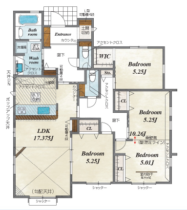 | 白岡駅徒歩19分。リビングが16.5帖あり家族でゆったりくつろげます。リビングイン階段なので自然とご家族とのコミュニケーションが広がります。隣の和室5.2帖は客間やお昼寝スペースにいいですね。対面キッチン採用でお子様の様子を見られて安心です。浴室場乾燥機付きなので雨の日も安心です。TVモニター付きインターフォン、防犯カメラといった防犯対策もばっちりです。カースペースは約1台分です。 |
